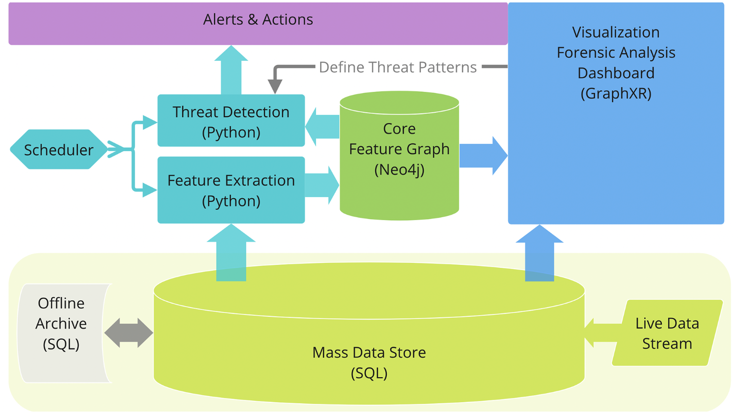 Kineviz implemented a two-tiered solution. First, we set up a system to detect patterns of interest in the real-time data stream as it feeds into the SQL data lake. The filter extracts patterns and saves them to a graph database. Simultaneously, another program monitors these real-time signals and generates alerts that can trigger both human and automated responses via API.